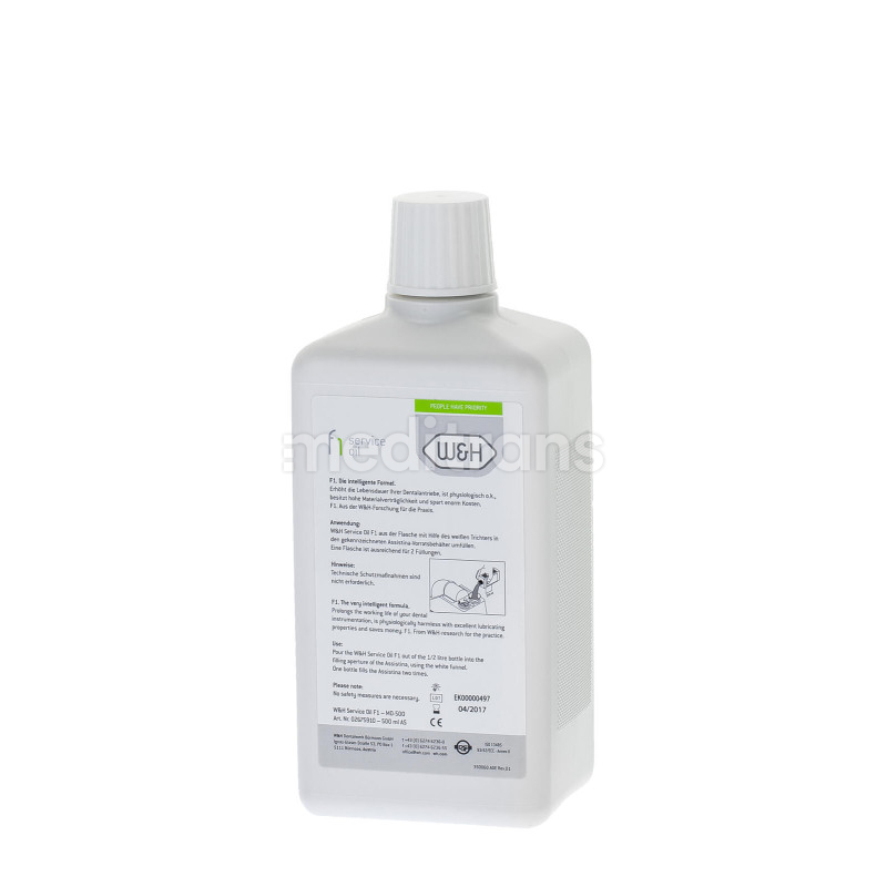 Syntetyczny olej serwisowy F1 (M-500) firmy W&H, stworzony specjalnie do konserwacji turbin, prostnic, kątnic, instrumentów chirurgicznych, skalerów oraz silników powietrznych.