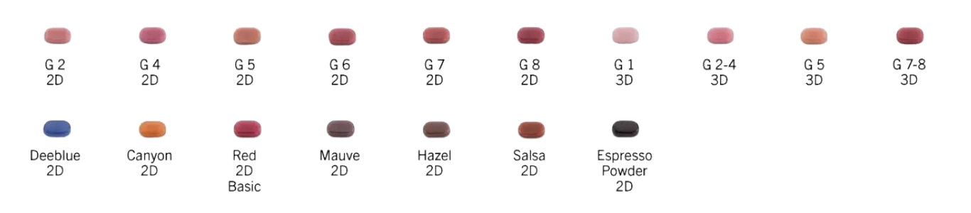Indywidualizacja barwy dziąseł i detali w cienkich warstwach; idealne do wykańczania powierzchni przed aplikacją mas 3D. | Modelowanie i charakteryzacja objętościowa tkanek miękkich, uzyskanie naturalnej przezierności i efektów optycznych. |