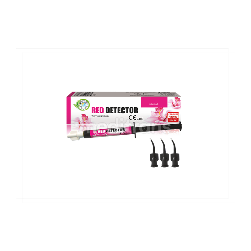 Red Detector to preparat marki Cerkemed przeznaczony do wykrywania próchnicy, dostępny w formie strzykawki zawierającej 2 ml produktu.