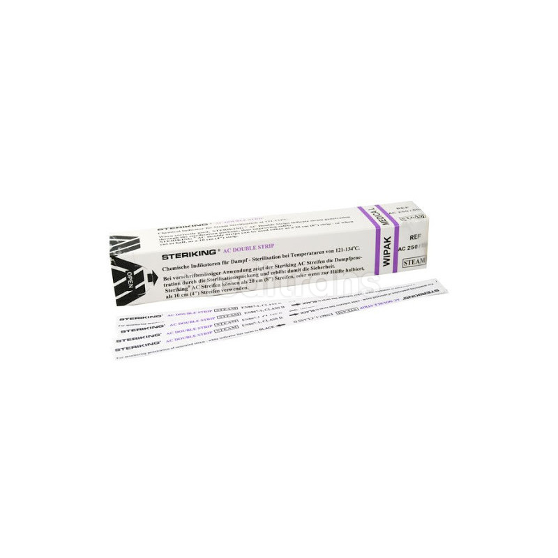 Paski wskaźnikowe do sterylizacji parowej: AC 250/500 (typ 4) STERIKING, stanowiące idealne rozwiązanie dla stomatologów dążących do utrzymania najwyższych standardów sterylności narzędzi medycznych.